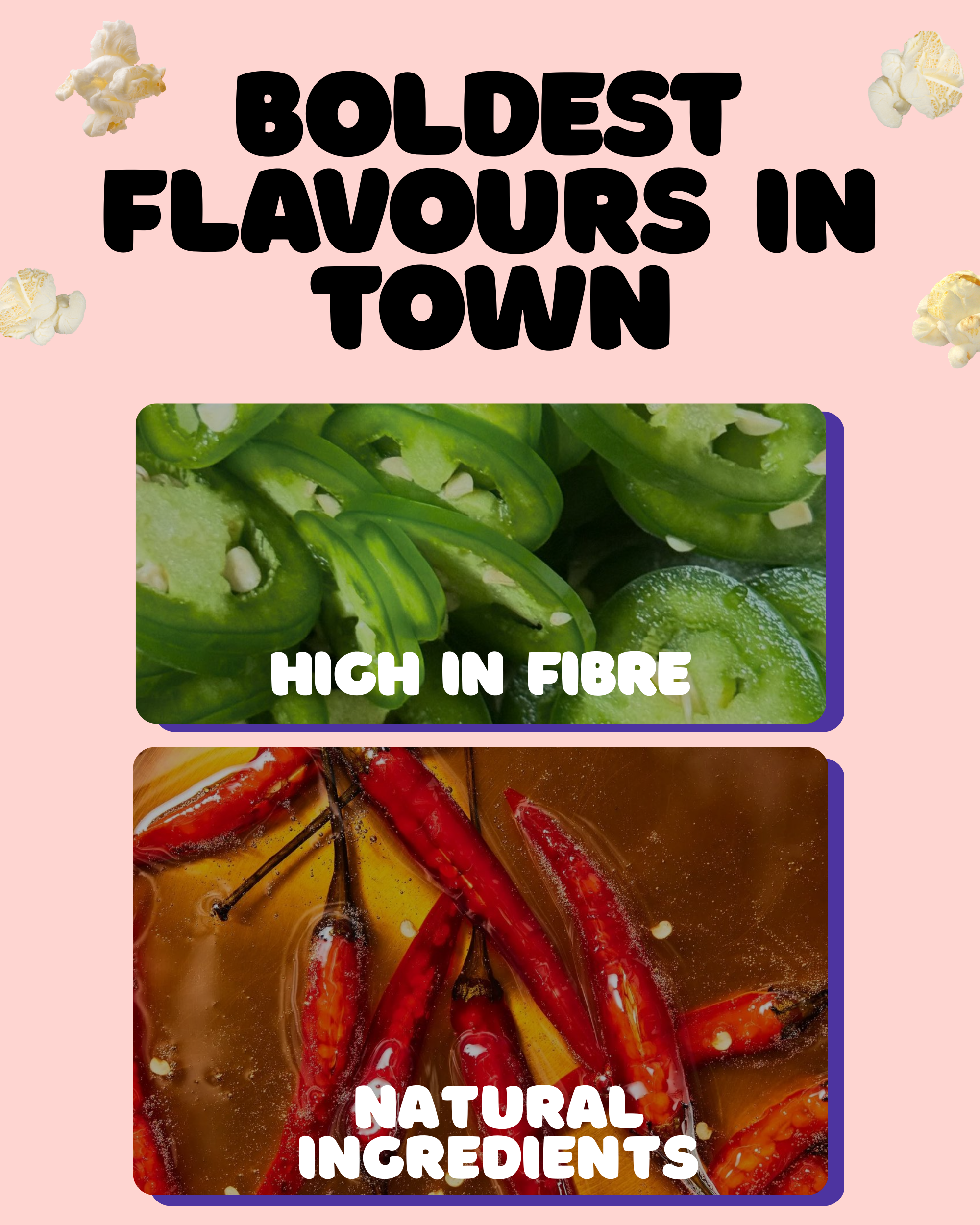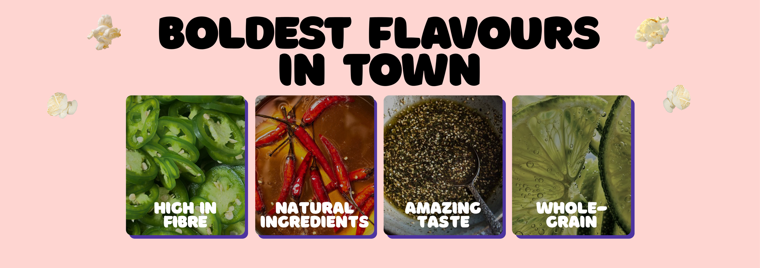Your new favourite popcorn. BOLD flavours and high in fibre: 100% snack satisfaction.